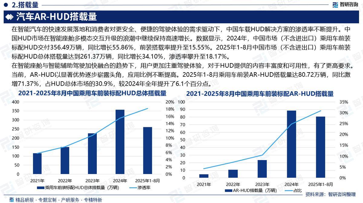 搭载量:在智能座舱与智能辅助驾驶加快融合的趋势下,用户更加注重驾驶体验,对于HUD提供的内容丰富度和可用性,有了更高要求。当前,AR-HUD以显著优势逐步崭露头角,应用比例不断提高。2025年1-8月乘用车前装AR-HUD搭载量达80.72万辆,同比激增71.37%,占HUD总体市场的30.9%,较2024年提升了6.1个百分点。