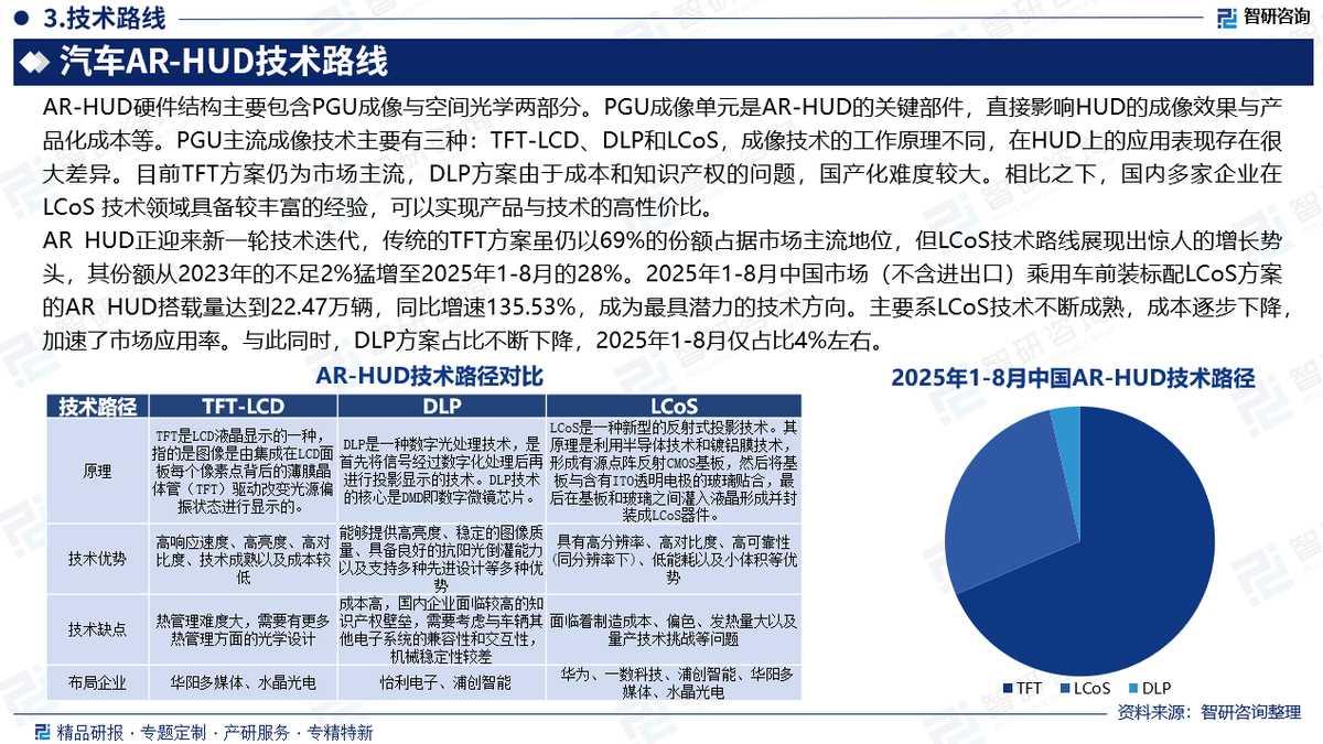 车载HUD经历三代升级,分别为C-HUD、W-HUD、AR-HUD。AR-HUD利用增强现实技术,将虚拟图像与现实场景拟合叠加,提供更加丰富和直观的驾驶信息。在智能座舱与智能辅助驾驶加快融合的趋势下,用户更加注重驾驶体验,对于HUD提供的内容丰富度和可用性,有了更高要求。当前,AR-HUD以显著优势逐步崭露头角,应用比例不断提高。2025年1-8月乘用车前装AR-HUD搭载量达80.72万辆,同比激增71.37%,占HUD总体市场的30.9%,较2024年全年提升了6.1个百分点。其成像技术主要有TFT-LCD、DLP和LCoS三种,传统的TFT方案虽仍以69%的份额占据市场主流地位,但LCoS技术路线展现出惊人的增长势头,其份额从2023年的不足2%猛增至2025年1-8月的28%。2025年1-8月中国市场(不含进出口)乘用车前装标配LCoS方案的AR HUD搭载量达到22.47万辆,同比增速135.53%,成为最具潜力的技术方向。主要系LCoS技术不断成熟,成本逐步下降,加速了市场应用率。与此同时,DLP方案占比不断下降,2025年1-8月仅占比4%左右。AR-HUD成本不断下降,进一步拉动需求,2024年中国AR-HUD前装平均价格已降至千元左右,一方面,国产品牌技术日益成熟,叠加渗透率提升带来的规模效应,为AR-HUD降价提供了空间。另一方面,车市竞争日益激烈,价格战背景下,车企降本增效需求迫切,要求相关零部件厂商降低价格。竞争方面,在传统W-HUD领域,外资企业如日本精机、日本电装、大陆集团凭借深厚的积累曾占据重要地位。但近几年,在汽车电动化、智能化浪潮下,水晶光电、华阳多媒体、怡利电子等国产企业在HUD领域取得了明显突破,并在AR-HUD赛道上实现弯道超车,本土厂商已牢牢掌握AR-HUD市场主导权。未来,AR-HUD行业将朝着渗透率提升、技术进步、竞争加剧的方向发展。
