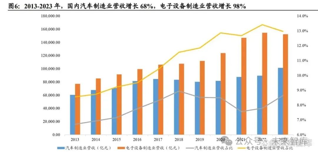 汽车、电子及新能源(锂电和光伏)是中国工业机器人下游最广泛的三个行业, 也是高度资本密集型行业。近 10 余年,这些行业营收和产量大幅提升,资本性支 出高增,由此显著拉动了整体机器人需求的爆发。 数据来看,2013-2023 年,国内汽车制造业营收增长 68%,制造业占比从 6.7%增 长至 8.6%;电子设备制造业营收增长 98%,制造业占比从 8.6%增长至 13.0%;光 伏年新增装机量增长超过 15 倍,锂电池总产量增长超过 26 倍。