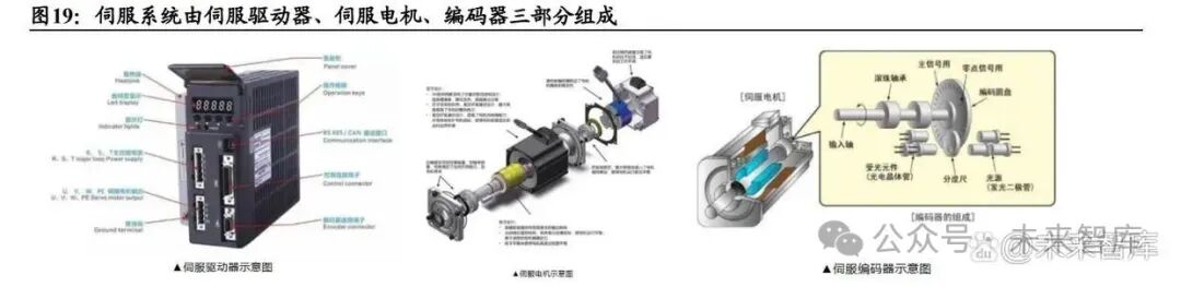 伺服系统是工业机器人主要的动力来源,由伺服驱动器、伺服电机、编码器三部 分组成。数控机床也是伺服系统下游的主要行业之一。