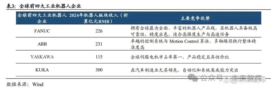 从全球整体出货量来看,工业机器人“四大家族”日本发那科、瑞士 ABB、日本安 川、KUKA 合计占据全球 50%以上的市场,在高端应用领域市占率更高,市场集 中度显著。