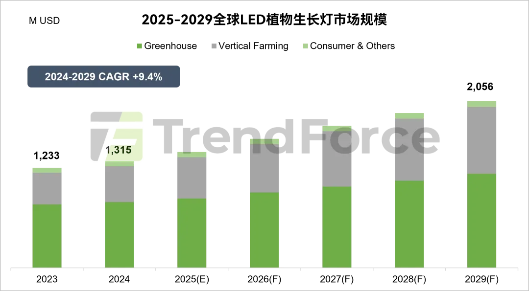 展望2025全年,TrendForce集邦咨询预估LED植物照明市场规模将达13.66亿美金,年增3.9%。到2029年,LED植物照明市场规模有机会成长至20.56亿美金。