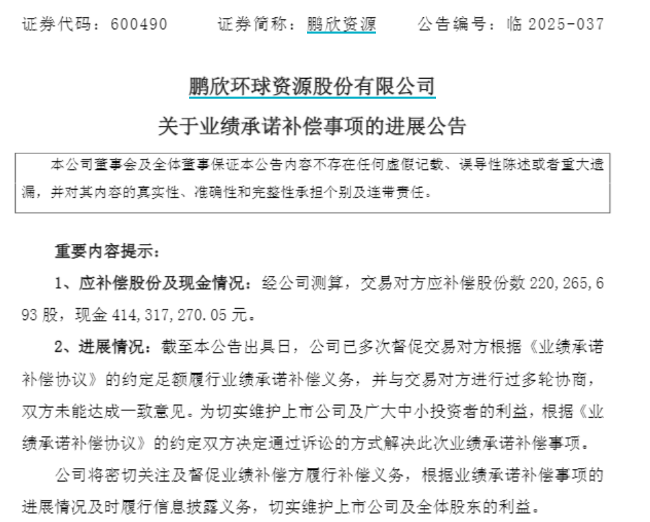 公司方面表示,根据《业绩承诺补偿协议》,交易对方应补偿股份2.2亿股(即全部所获股份)及现金4.14元,补偿义务应于2025年6月10日前完成现金支付。公司于2025年1月2日、4月27日、7月4日三次发函催告履行补偿义务,但交易对方未予落实。