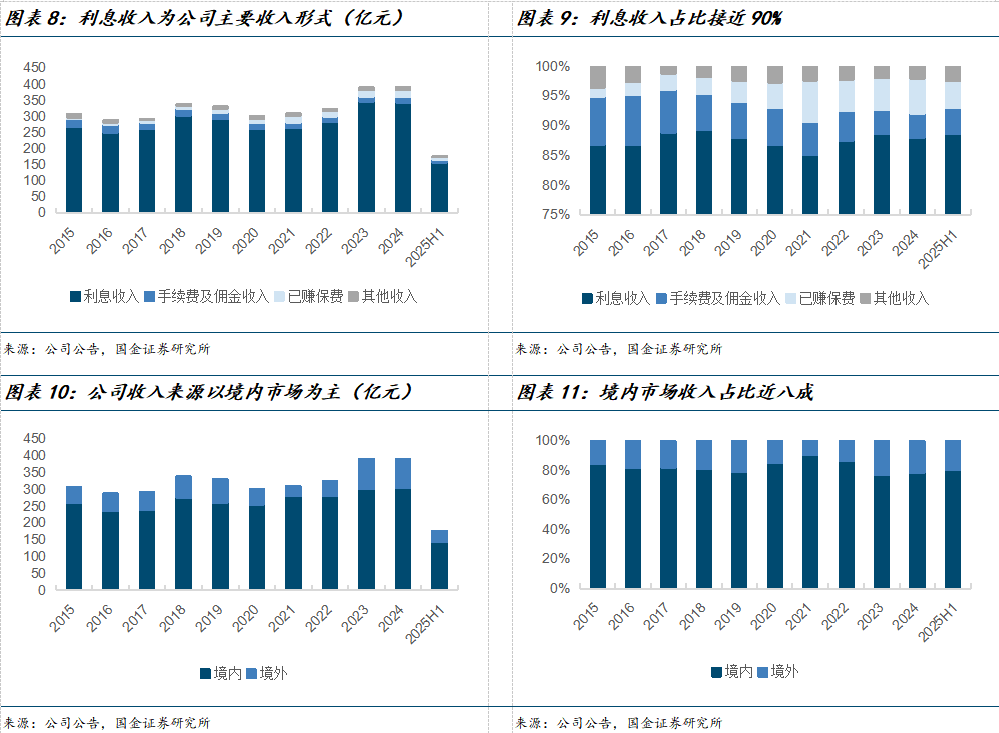商业银行、财务公司是公司的主要业务,盈利模式均为息差收入为主。按行业分类,2024年商业银行、财务公司、金融租赁、信托业务、其他业务分部营业收入分别为167、163、28、4、27亿元,占比分别为43%、42%、7%、1%、7%,其中商业银行、财务公司、金融租赁的收入形式均以利息收入为主。按收入形式分类,2024年利息收入、手续费及佣金收入、已赚保费、其他收入为343、16、23、8亿元,占比达88%、4%、6%、2%。