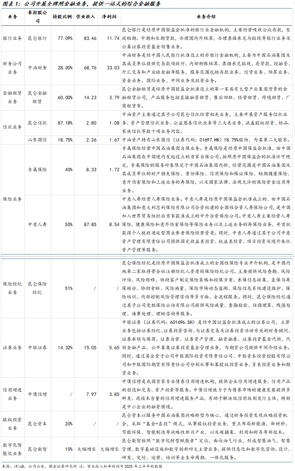 公司具备较多的牌照金融业务,提供一站式的综合金融服务。中油资本主要通过其控股公司昆仑银行、中油财务、昆仑金融租赁、中油资产、专属保险、昆仑保险经纪,以及参股公司中意人寿、中银证券、中债信增、昆仑资本与昆仑数智,分别经营银行、财务公司、金融租赁、信托、保险、保险经纪、证券、信用增进、股权投资与数字化智能化业务,是一家全方位综合性金融服务公司。