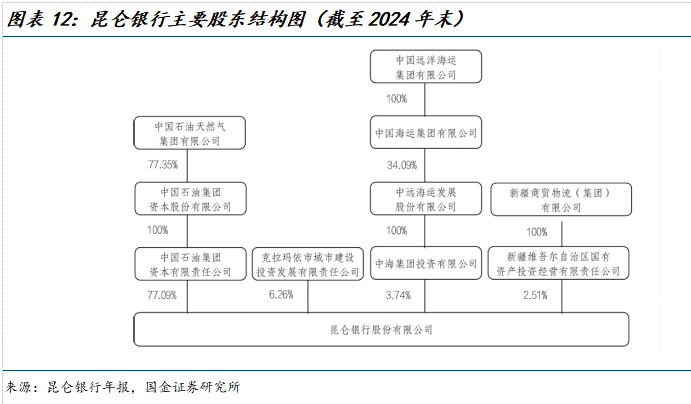 从股权结构看,中油资本作为昆仑银行的第一大股东,持股比例达77.09%。其他主要股东包括持股6.26%的克拉玛依市城市建设投资发展有限责任公司,以及派驻董事的中海集团投资有限公司(持股比例为3.74%)、新疆维吾尔自治区国有资产投资经营有限责任公司(持股比例为2.51%)等。