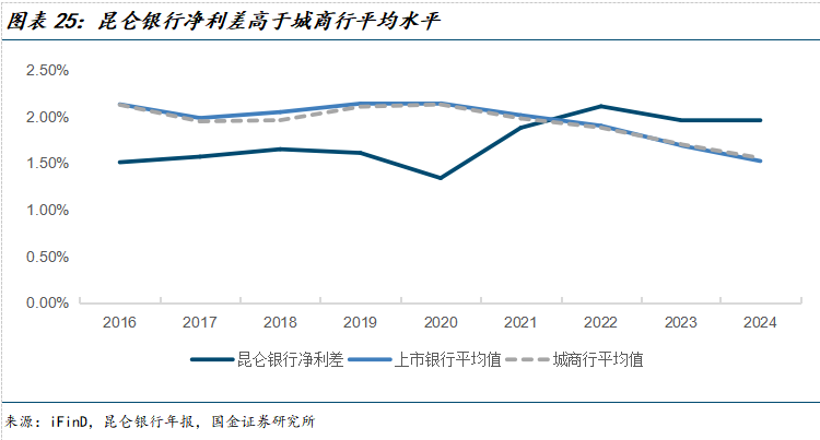 从价的角度来看,在行业利差收窄的背景下,昆仑银行净利差韧性突显。2021年以来昆仑银行净利差整体呈现逆势回升态势,并于2022年起持续高于上市银行平均水平。一方面,昆仑银行依托中国石油集团的产业背景,专注于石油产业链上下游的金融服务,其客户群体以石油产业链上下游客户为主,客户粘性高且客户资金实力雄厚、信用风险较低,贷款需求稳定且利率水平相对较高。另一方面,作为中国石油集团控股的银行,昆仑银行的资金来源相对稳定,在吸收存款时能够保持较低的成本,同时有望通过高效的资金融通管理,进一步优化了资金配置,降低了资金成本对净利差的影响。截至2024年末,昆仑银行净利差为1.97%,同比逆势提升1个基点,较城商行平均水平高41个基点,较上市银行平均水平高出45个基点。