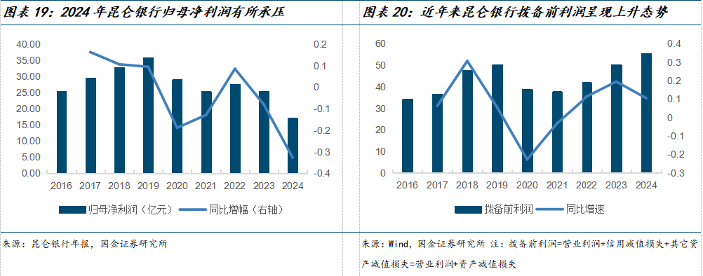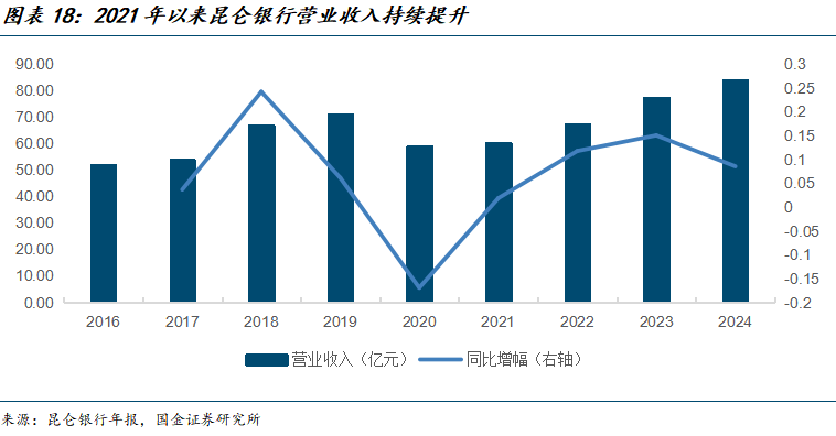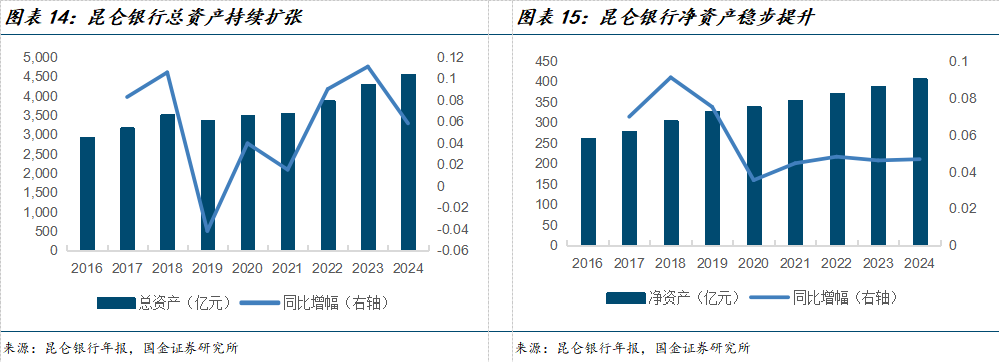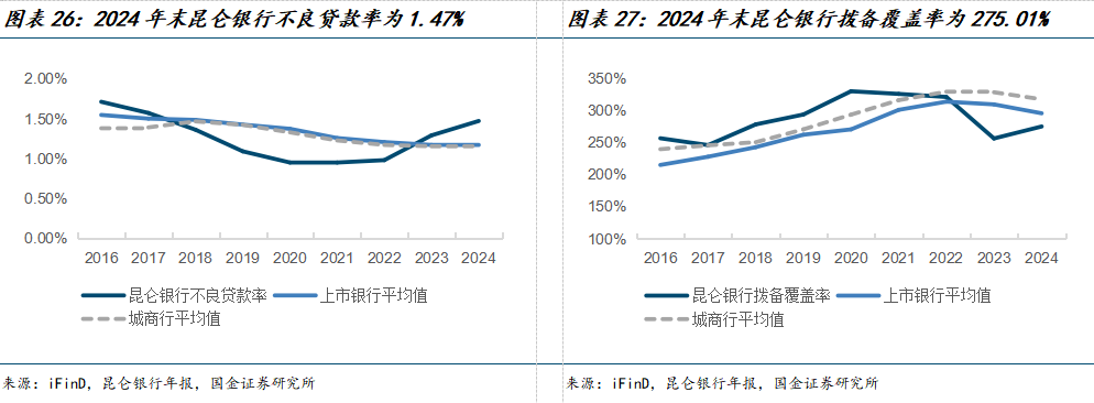 从拨备水平来看,昆仑银行拨备水平充足。随着减值准备的持续计提,昆仑银行的拨备覆盖率有所提升,截至2024年末其拨备覆盖率为275.01%,同比提升18.71pct。
