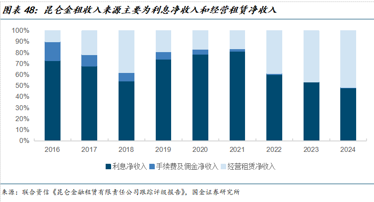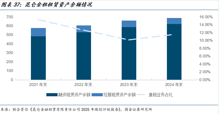 存量经营租赁资产主要集中在航空领域,2024年末经营租赁资产余额中飞机的规模为50.88亿元,占比为87%。2024年,为盘活存量资产,昆仑金融租赁出售部分飞机,经营租赁资产规模相应收缩。
