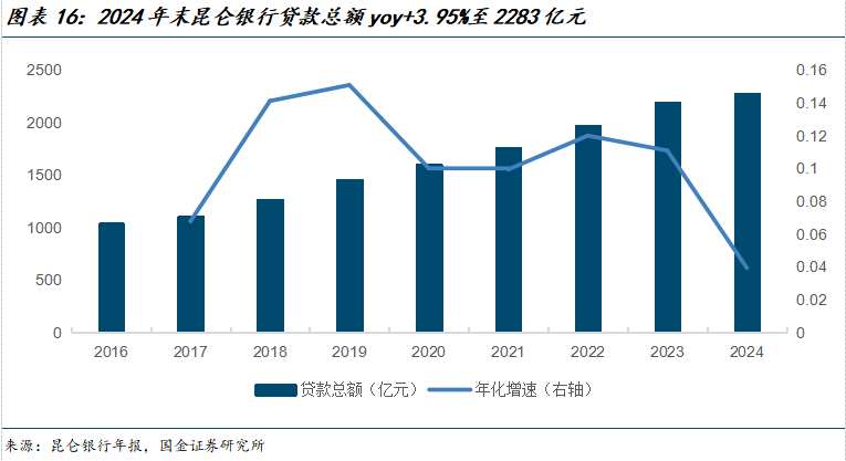2)贷款业务方面,昆仑银行积极拓展产融市场与产业链客户,持续优化资产结构。截至2024年末,公司金融板块的贷款(不含贴现)余额为1212.10亿元,同比增长0.31%;不良率为1.86%,同比微升0.1个百分点。