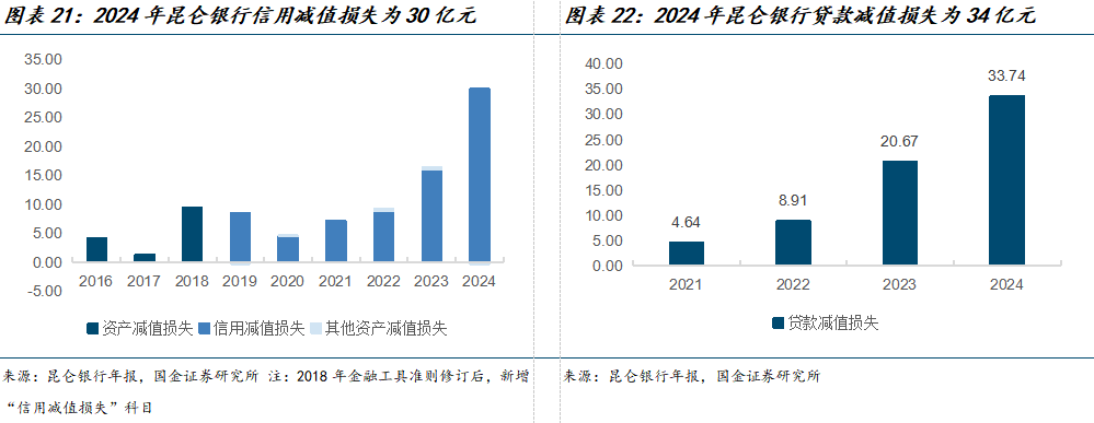从经营业绩来看,昆仑银行营收自2021年起稳步回升。2020年,受息差收窄、国际业务收入下滑及债券市场波动等因素影响,昆仑银行营收有所回落,但随后于2021年企稳并进入回升通道。2024年,昆仑银行实现营业收入84.27亿元(此为净收入口径,与前文上市公司商业银行业务分部统计口径存在差异),同比增长8.58%。2020-2023年昆仑银行归母净利润在25-29亿元区间,业绩较为稳健。2024年实现归母净利润17.04亿元,同比下降32.75%,主要系昆仑银行基于审慎原则贷款减值计提较为充分,2024年信用减值损失为30.04亿元,较上年增加13.87亿元,同比增幅85.81%,主要原因是贷款减值损失比上年增加13.07亿元。