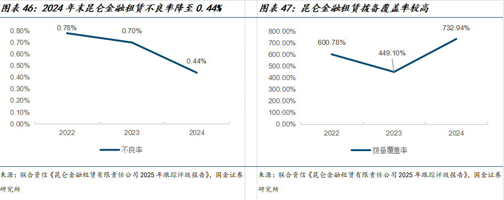 3)昆仑金租(持股比例为60%):资产集中于交通与能源领域,资产质量优异,24年末不良租赁资产占比为0.44%,同比下降0.26pct。