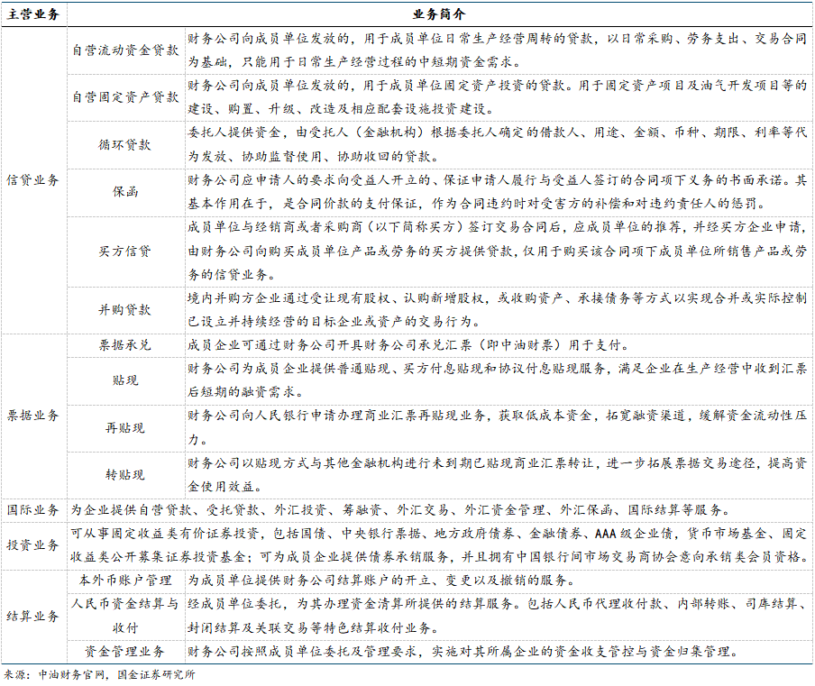 通过北京总部、4家境内分公司和中国香港、迪拜、新加坡3家境外子公司,中油财务为中国石油集团及其成员单位提供交易款项收付、内部转账结算、票据承兑贴现、存贷款、投融资、外汇交易和产业链金融等服务,服务范围包括存款业务、信贷业务、结算业务、资金业务、国际业务、中间业务及投资业务。