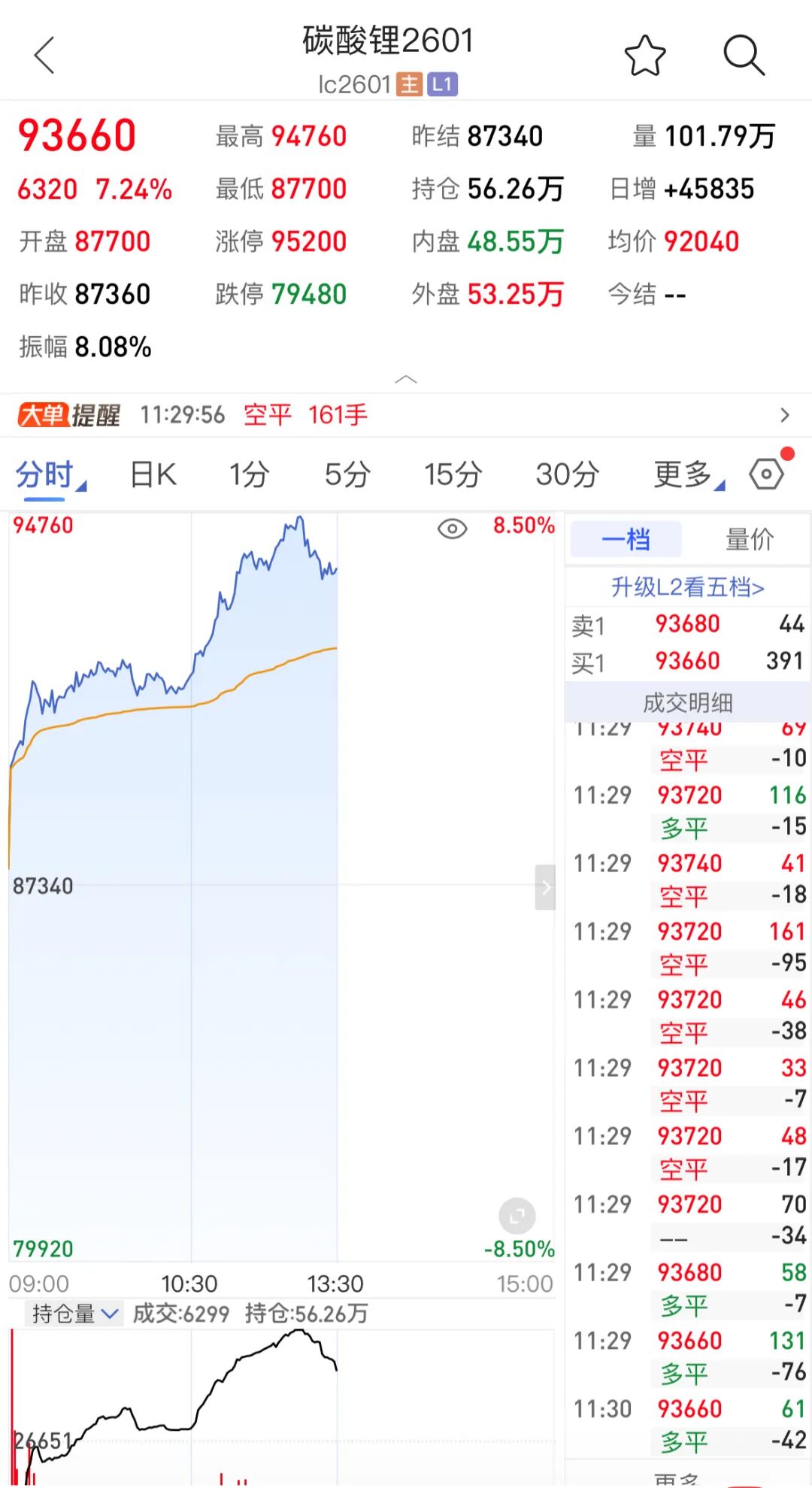 期货市场上,11月17日,碳酸锂2601主力合约盘中一度涨超8%,价格飙升至9.4万元/吨上方。