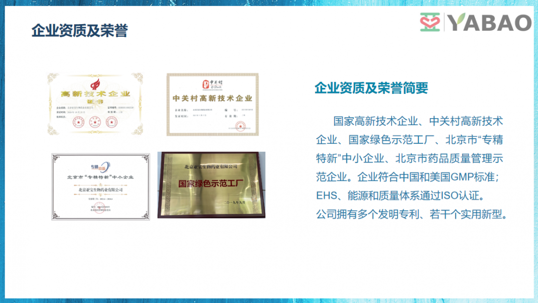 北京亚宝生物药业有限公司,2007年成立,为亚宝药业集团的全资子公司,集团的八大生产基地之一,是符合国际先进标准的现代化制药生产基地。公司位于北京市北京经济技术开发区,注册资金8,000万,公司占地面积17,088.6平方米,建筑面积20,119平方米。按照美国FDA cGMP标准及国际化的企业管理模式和机制,以开发欧美医药市场为导向,引入国际一流的生产设备设施进行生产。