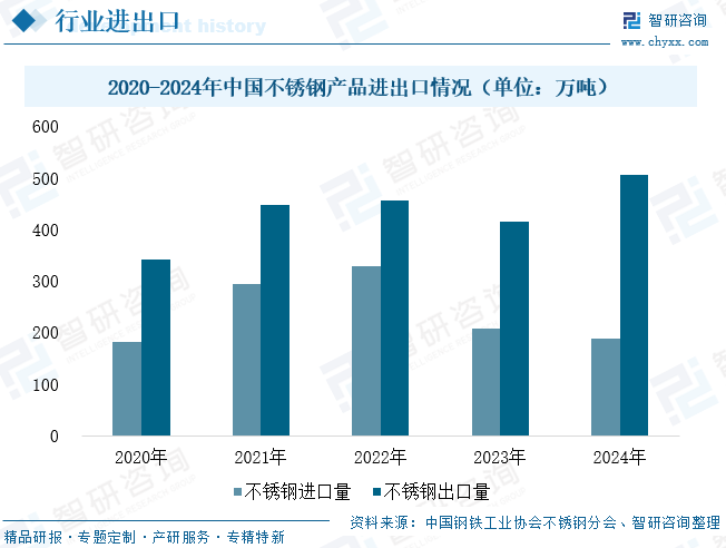 近年来,我国不锈钢进出口市场呈现“进口收缩、出口扩张”的总体趋势,且受国际贸易政策与市场需求变化影响,波动较为明显。进口方面,2020年至2022年受印尼不锈钢产能释放及国内需求增长驱动,进口量从180.4万吨跃升至328.5万吨,但2023年因印尼项目投产节奏调整及海外反倾销政策影响,进口量骤降36.96%至207.09万吨,2024年延续回落趋势至187.77万吨,同比减少9.3%。出口方面,2020年至2022年保持稳步增长,2021年出口量突破446.1万吨,2022年微增至455.13万吨,但2023年受全球供应链重构及海外需求疲软影响,出口量回落9.1%至413.73万吨,2024年则凭借国内成本优势及新兴市场需求(如越南、巴基斯坦)爆发,出口量同比激增25.6%至504.42万吨,创历史新高。