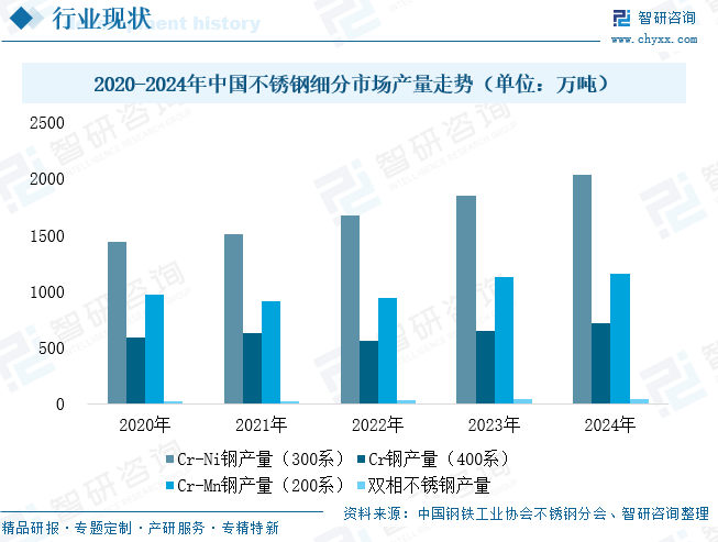 从不锈钢细分产品看,2024年Cr-Ni钢(300系)以2029.14万吨产量占据半壁江山(占比51.45%),同比增长9.57%,其优异的耐蚀性和加工性能持续巩固在高端装备、建筑装饰等领域的优势地位;Cr钢(400系)产量达717.47万吨(占比18.19%),增幅10.73%,凭借高强度和耐氯化物腐蚀特性,在厨具、家电及建筑结构领域加速替代传统材料;Cr-Mn钢(200系)产量虽增至1156.33万吨,但占比下滑至29.32%,其低成本优势仍主导中低端日用品市场;双相不锈钢产量突破41.17万吨(占比1.04%),4.66%的稳健增长印证了其在海洋工程、石油化工等严苛工况下的不可替代性,高端化趋势愈发显著。