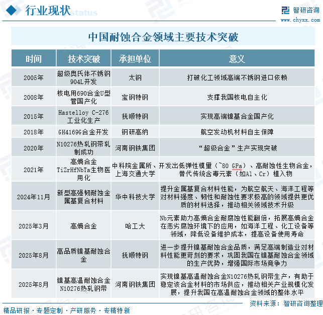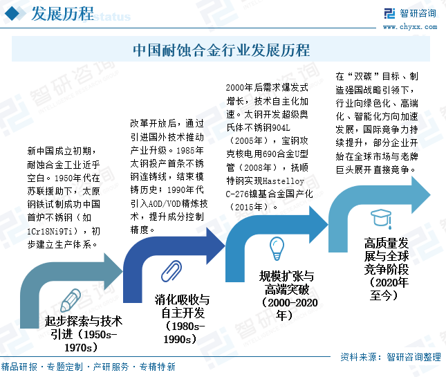 中国耐蚀合金行业起步于20世纪50年代新中国成立初期,在苏联技术援助下初步建立不锈钢生产能力,随后经历自主探索但技术瓶颈明显、应用局限的艰难起步阶段;80-90年代改革开放后,通过大规模技术引进与产线升级,消化吸收国外技术,实现规模扩张,产品系列和应用领域不断拓宽,但存在低端过剩、高端不足的问题;进入21世纪(2000-2020年),在国家重大工程需求驱动下,行业迎来自主创新与高端突破阶段,在镍基合金国产化、产业体系完善、标准与检测能力建设等方面取得重大进展,实现从“跟跑”到“并跑”的转变;“十四五”以来,行业进入高质量发展阶段,在绿色低碳转型、原创技术突破、产业链协同、国际化布局等方面不断推进,国际竞争力持续提升,正朝着从“材料大国”向“材料强国”跨越的目标迈进。