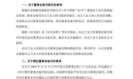 11月17日晚间,棕榈股份(002431)发布公告称,公司董事会于近日收到副总经理、董事会秘书冯玉兰的书面辞任报告,冯玉兰因工作岗位调整,申请辞去公司董事会秘书职务。辞任董事会秘书职务后,仍继续担任公司副总经理职务。