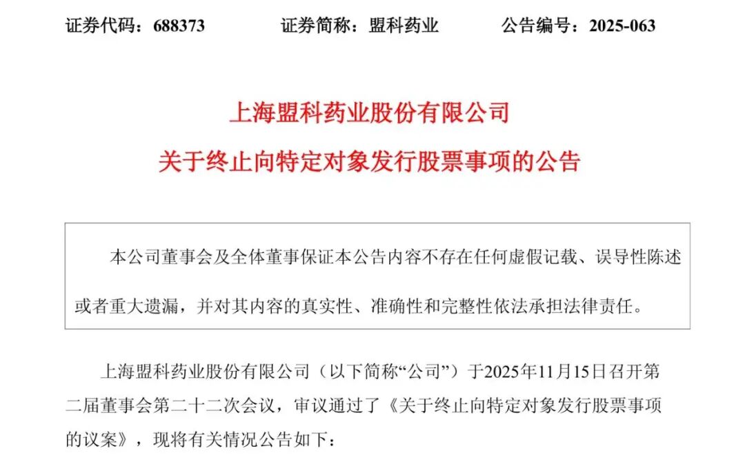 盟科药业公告表示,在多次沟通无果后,公司判断持续推进该方案可能影响稳健经营,为维护全体股东尤其是中小股东的长远利益,董事会最终决定终止本次定增。