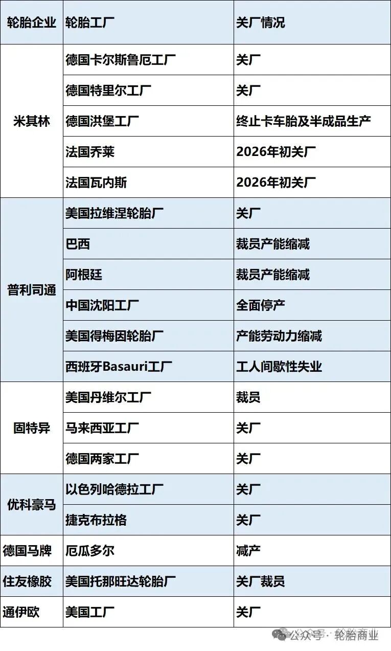 德国马牌则宣布了对马来西亚工厂和印度一家工厂的关停;