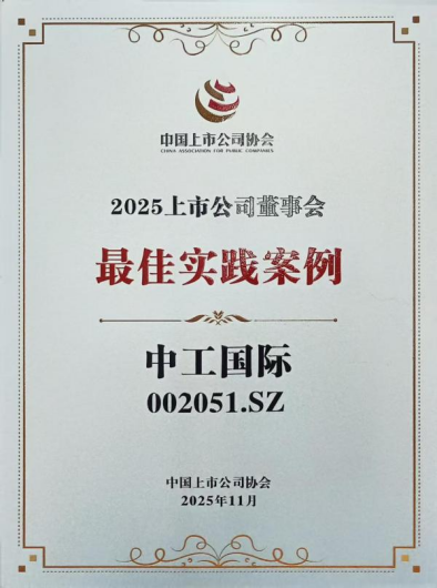 中国上市公司协会正式发布 2025 年上市公司 “董事会最佳实践案例” 及 “可持续发展最佳实践案例” 评选结果。中上协“董事会最佳实践”评选是资本市场治理领域的权威标杆,自 2023 年启动以来已成功举办三届。中工国际凭借卓越的公司治理能力,连续第三年斩获 “董事会最佳实践案例” 荣誉;同时,公司聚焦 ESG 治理的实践成果 ——《以 ESG 治理为根基 以 “四绿” 引擎为驱动 助力上市公司高质量可持续发展》,成功入选 “可持续发展最佳实践案例”,实现双项殊荣加身。公司董事会秘书芮红出席会议,并代表公司领取相关奖项。