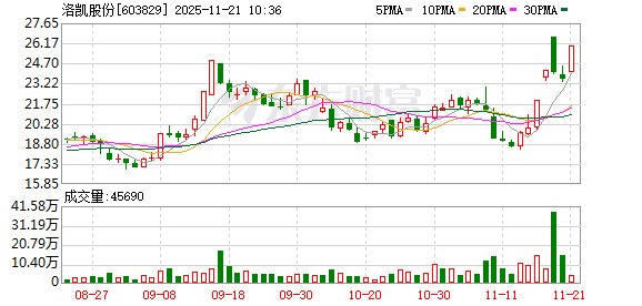 洛凯股份再度涨停,5个交易日内录得3个涨停,累计涨幅为29.89%,累计换手率为44.36%。截至9:41,该股今日成交量381.84万股,成交金额9635.27万元,换手率2.09%。最新A股总市值达47.36亿元。