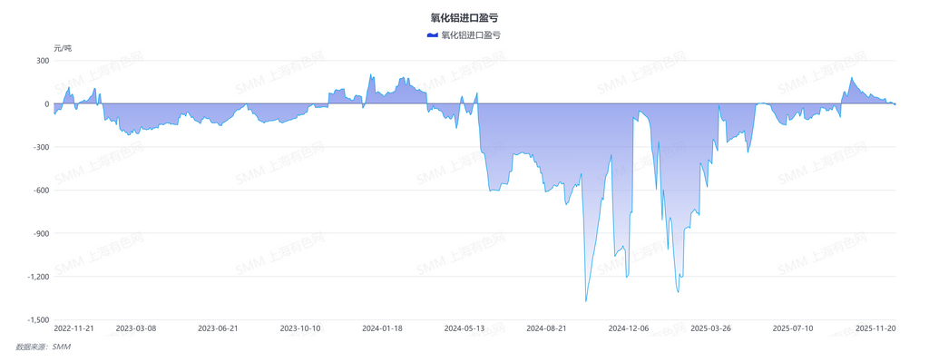 由于10月国内氧化铝现货价格持续高于海外氧化铝运至国内主流港口的折算售价,进口利润可观,推动了海外氧化铝的进口。2025年1-10月,我国累计向俄罗斯出口氧化铝167.9万吨,占出口总量的77.18%。尽管10月对俄出口量有所回落,但整体规模仍保持稳定。截至11月20日,从价差结构来看,尽管海外氧化铝折算至国内主流港口的售价已高于国内指数价格,但南方地区现货价格仍高于进口成本,表明进口窗口依然开启,对国内市场仍构成一定压力。