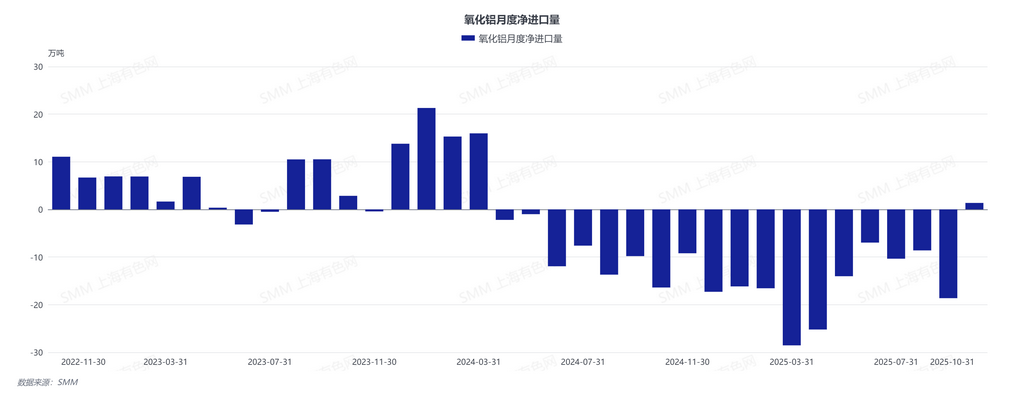 2025年1-10月,中国累计进口氧化铝73.78万吨,同比减少43.47%;中国累计出口氧化铝217.53万吨,同比增加54.71%;中国累计净进口氧化铝-143.75万吨。