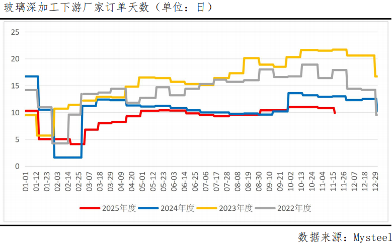 尽管玻璃供应端出现了一些积极因素,但需求端表现仍然疲软,房地产行业低迷直接拖累玻璃需求,深加工企业普遍面临订单不足的困境,玻璃深加工下游厂家订单天数已降至9.9天,创近年来新低。随着北方地区进入冬季,建筑工地施工进一步放缓,需求呈现季节性走弱。