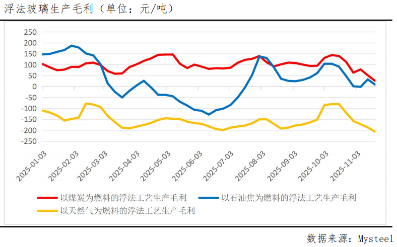成本支撑效应增强是不容忽视的因素。Mysteel最新数据显示,截至11月21日,以煤炭为燃料的浮法工艺生产毛利为25.79元/吨,创年内新低;以石油焦为燃料的浮法工艺生产毛利为8.52元/吨;以天然气为燃料的浮法工艺生产毛利为-206.84元/吨。随着煤炭价格重心上移,玻璃生产成本整体呈提升态势,尽管近期煤炭价格自高位出现回落,但随着煤炭期价回落至高位震荡区间下沿附近后跌势减缓,市场对于玻璃成本端支撑的信心有所增强。