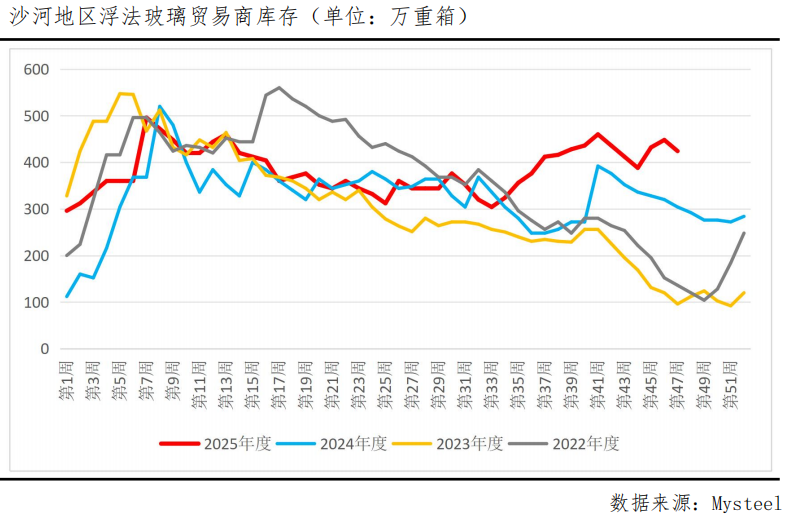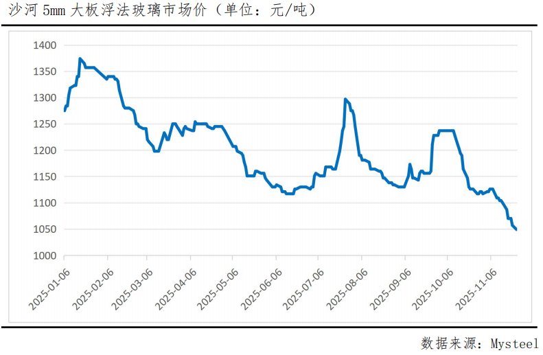 国庆假期后,生产企业为缓解库存压力,进行过一轮降价促销。沙河地区大板成交均价从10月初的1237元/吨左右一路跌至10月末的1117元/吨附近。10月末11月初,现货价格短暂走稳,但在终端需求持续偏弱的压力下,11月中旬现货价格再度走弱,Mysteel数据显示,截至11月24日,沙河5mm大板浮法玻璃市场价为1049元/吨,续创新低。主销区价格的持续下跌仍将影响整体市场情绪。