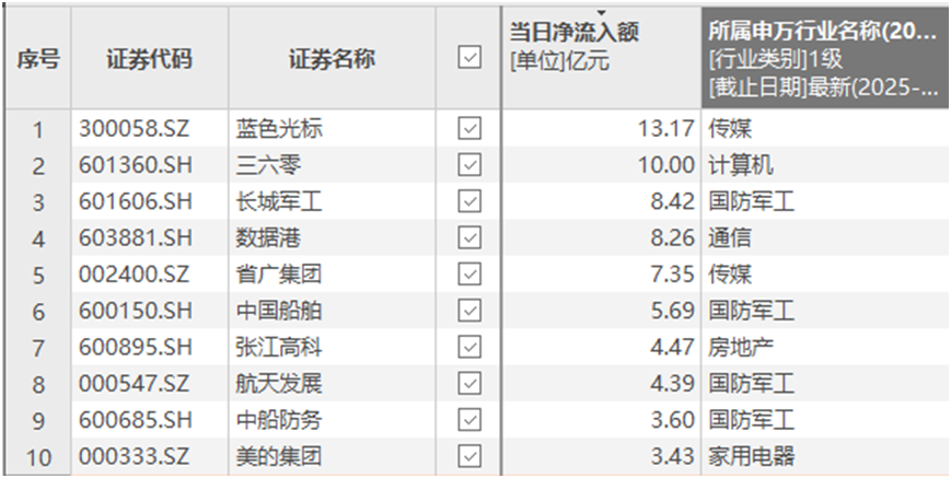 上证报中国证券网讯(记者 徐蔚)数据显示,11月24日,当日资金净流入额排名靠十的个股依次是蓝色光标、三六零、长城军工、数据港、省广集团、中国船舶、张江高科、航天发展、中船防务、美的集团,净流入额在3.43亿元至13.17亿元不等。其中,长城军工、中国船舶、航天发展、中船防务属于通信设备板块。