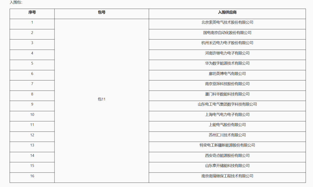 北京索英电气技术股份有限公司、杭州禾迈电力电子股份有限公司、华为数字能源技术有限公司、南京南瑞继保工程技术有限公司、南京亚派科技股份有限公司 、厦门科华数能科技有限公司 、山东电工电气集团数字科技有限公司、山东泰开储能科技有限公司、上海电气电力电子有限公司、上能电气股份有限公司、特变电工新疆新能源股份有限公司、西安奇点能源股份有限公司,入选2个标包;