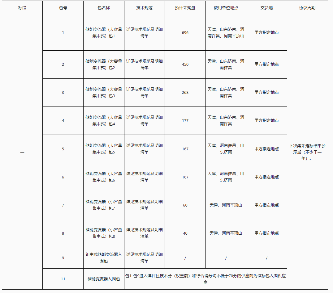 根据招标公告,此次招标共11个标包。包1-包6为储能变流器(大容量集中式);包7-包8为储能变流器(小容量集中式),包9为组串式储能变流器入围包;包11为储能变流器入围包。