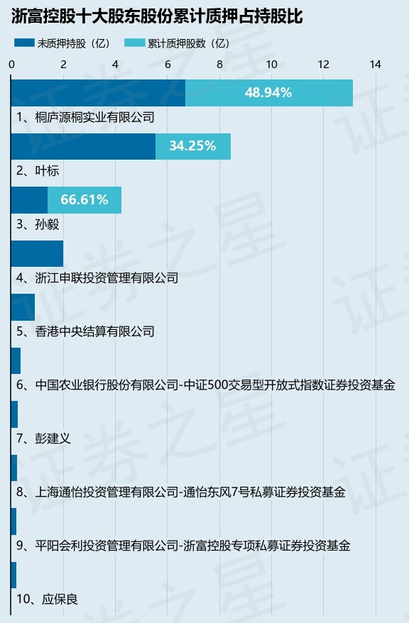 截止本公告日,股东桐庐源桐实业有限公司已累计质押股份6.42亿股,占其持股总数的48.94%,股东叶标已累计质押股份2.89亿股,占其持股总数的34.25%,股东孙毅已累计质押股份2.82亿股,占其持股总数的66.61%。本次质押后浙富控股十大股东的累计质押股份占持股比例(占持股比例的计算以公司最新一期财务报表公布的十大股东的持股总数为基准)见下图: