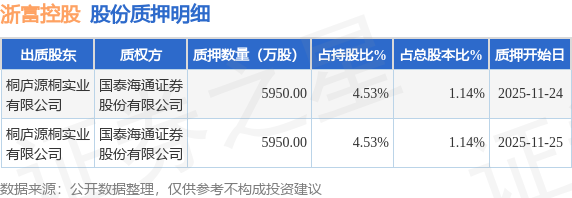 证券之星消息,浙富控股(002266)11月26日公开信息显示,股东桐庐源桐实业有限公司向国泰海通证券股份有限公司合计质押1.19亿股,占总股本2.28%。质押详情见下表: