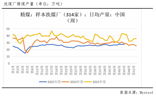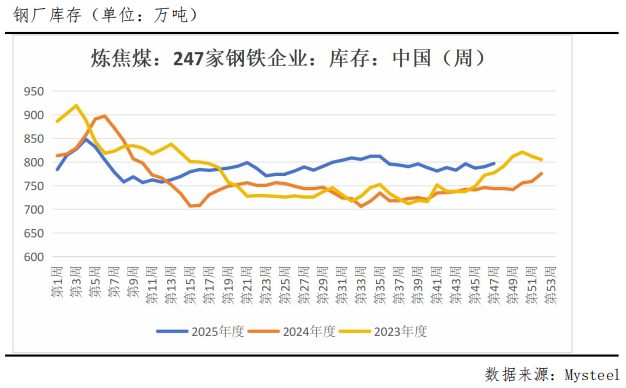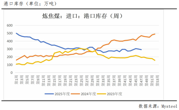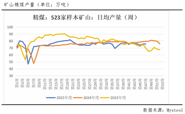 当前国内焦煤供应呈现逐步回升态势,但整体水平仍低于去年同期,反映出国内供应端持续受到安全监管趋严及生产条件复杂等因素的共同制约。据Mysteel最新统计数据显示,截至11月21日当周,523家样本矿山精煤日均产量75.8万吨,环比持平,同比减少3.78万吨,降幅4.75%;314家样本洗煤厂精煤日均产量27.63万吨,环比增加0.2万吨,增幅0.73%,同比减少1.06万吨,降幅3.69%。尽管近期国家发改委召开2025—2026年供暖季能源保供视频会议,明确强调保障冬季能源稳定供应,市场对煤矿增产预期有所增强,但在实际执行中,受制于常态化安全检查与部分矿井井下工作面条件限制,局部区域产量仍存在收缩压力,预计整体供应增量空间有限。