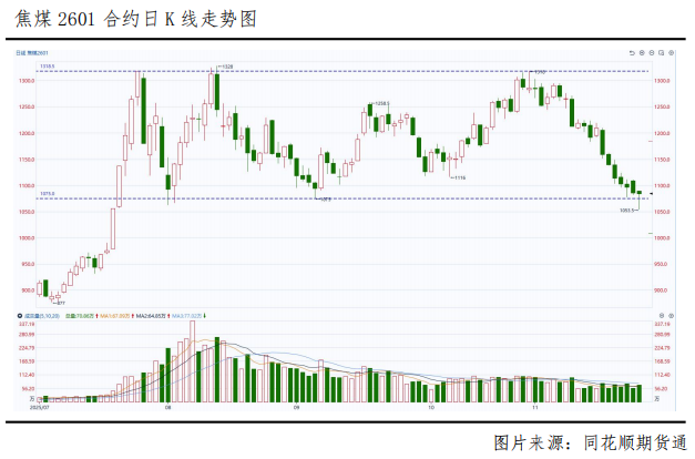 今日,焦煤主力合约放量下破关键支撑失败,持仓量减少20519手。截至11月26日下午收盘,焦煤2601收盘报价1084.5元/吨,较前一交易日结算价下跌12.5元/吨,跌幅1.14%。在区间下沿受到强力支撑,焦煤止跌了吗?