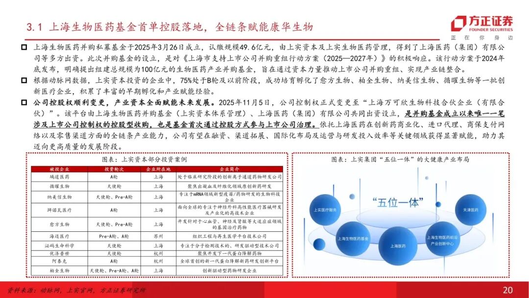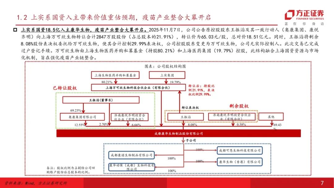 控制权变更落地,上实系入主有望带来长期产业赋能。2025年11月7日,康华生物完成控制权变更,上海万可欣生物科技合伙企业(有限合伙)成为公司控股股东,持股比例达21.91%,表决权比例提升至29.99%,标志着上海生物医药并购私募基金联合上海医药(集团)有限公司通过“基金+产业”模式首次控股上市公司,同时为疫苗行业提供了“基金主导、产业协同”的战略范本,预计将通过技术融合、渠道共建和资本协同,为公司在融资效率、创新研发、渠道拓展及全球化等核心领域注入全方位赋能。在行业竞争格局升级、政策推动创新与整合的大背景下,公司迎来持续成长新契机,后续万可欣生物及其股东资源的联动和“控股+协同”机制值得重点关注。
