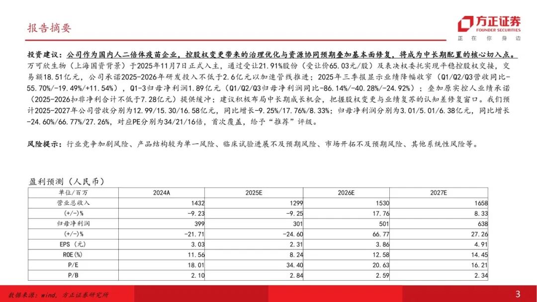 投资建议:公司作为国内人二倍体疫苗企业,控股权变更带来的治理优化与资源协同预期叠加基本面修复,将成为中长期配置的核心切入点。万可欣生物(上海国资背景)于2025年11月7日正式入主,通过受让21.91%股份(受让价65.03元/股)及表决权委托实现平稳控股权交接,交易额18.51亿元,公司承诺2025-2026年研发投入不低于2.6亿元以加速管线推进;2025年三季报显示业绩降幅收窄(Q1/Q2/Q3营收同比-55.70%/-19.49%/+11.54%),Q1-3归母净利润1.89亿元(Q1/Q2/Q3归母净利润同比-86.14%/-40.28%/-24.92%);叠加原实控人业绩承诺(2025-2026扣非净利合计不低于7.28亿元)提供缓冲;建议积极布局中长期成长机会,把握股权变更与业绩复苏的认知差修复窗口。我们预计2025-2027年公司营收分别为12.99/15.30/16.58亿元,同比增长-9.25%/17.76%/8.33%;归母净利润分别为3.01/5.01/6.38亿元,同比增长-24.60%/66.77%/27.26%,对应PE分别为34/21/16倍,首次覆盖,给予“推荐”评级。