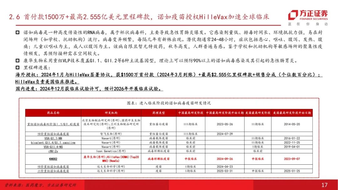 重磅在研管线获国际认可,打开第二成长曲线。公司重组六价诺如病毒疫苗是目前全球在研价次最高的诺如疫苗之一,其广谱保护能力覆盖主流毒株(如GI.1、GII.2),已获得澳大利亚、美国和中国临床试验许可,展示了国际权威认可的技术壁垒。