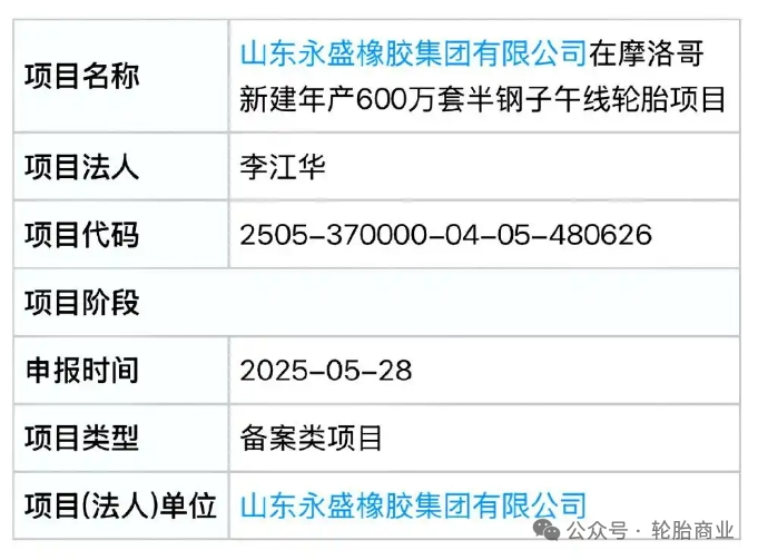 2025年5月28日,山东永盛橡胶集团有限公司完成了“摩洛哥新建年产600万套半钢子午线轮胎项目”备案。根据规划,永盛橡胶的摩洛哥产能基地将主要面向欧洲、非洲及美洲市场供应。