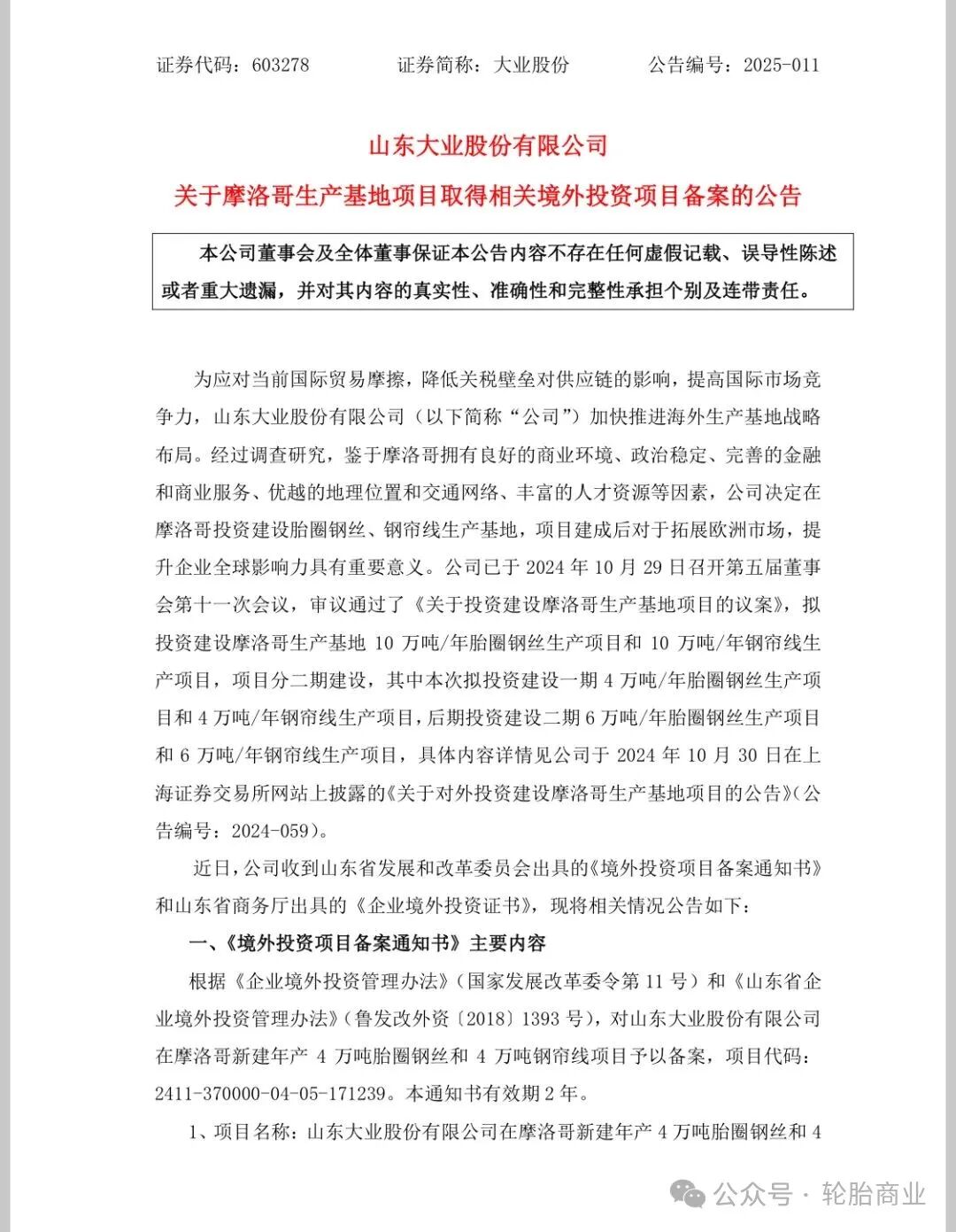 2025年4月,山东大业股份有限公司官宣在摩洛哥投资建设胎圈钢丝、钢帘线生产基地。根据规划,这一海外基地将分两期建设,一期项目涵盖了4万吨胎圈钢丝和4万吨钢帘线项目的年产能;二期项目则将投资建设年产能为6万吨胎圈钢丝和6万吨钢帘线生产线。合计投资超14亿人民币,用于实现10万吨胎圈钢丝和10万吨钢帘线的年产能。