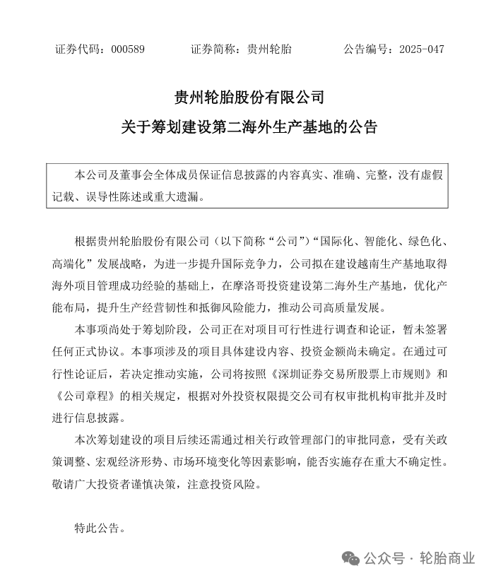 2025年8月。贵州轮胎发布工厂,宣布将在摩洛哥投资建设其第二海外生产基地。摩洛哥建厂可以看作是继贵州轮胎布局半钢轮胎项目之后的又一重要决定。