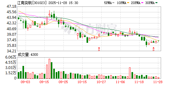 江南奕帆11月28日大宗交易平台出现一笔成交,成交量5.60万股,成交金额208.21万元,大宗交易成交价为37.18元。该笔交易的买卖双方均为机构专用席位。