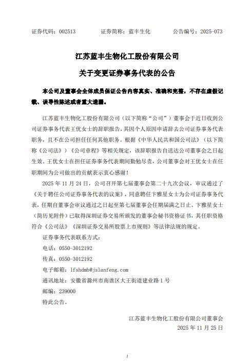11月26日,蓝丰生化(002514)公告称,公司董事会于近日收到公司证券事务代表王优女士的辞职报告,其因个人原因申请辞去公司证券事务代表职务,且不在公司担任任何其他职务。