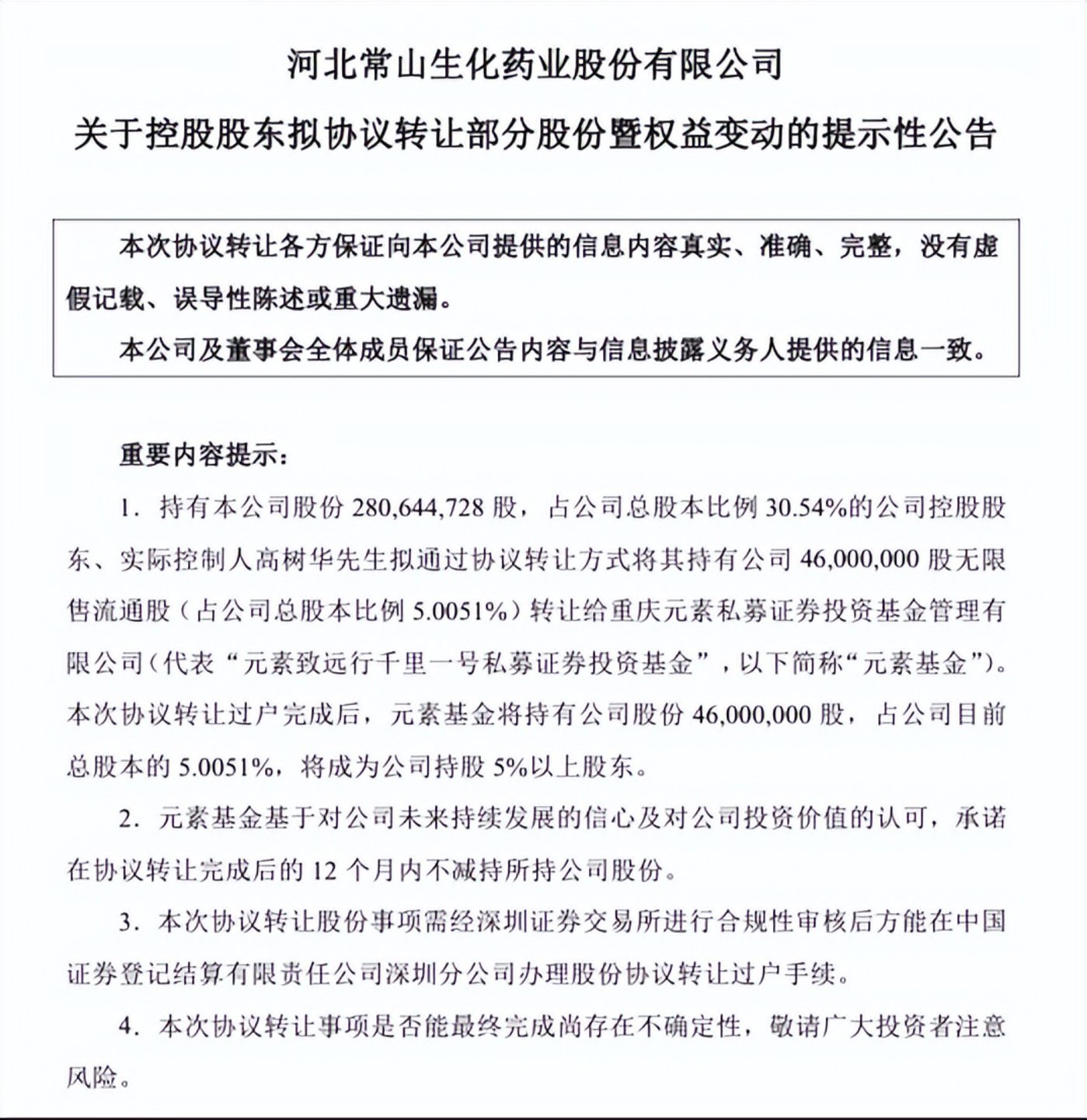 据悉,近日常山药业发布公告称,公司控股股东、实际控制人高树华先生拟通过协议转让方式将其持有公司46,000,000 股无限售流通股(占公司总股本比例 5.0051%)转让给重庆元素私募证券投资基金管理有限公司(代表“元素致远行千里一号私募证券投资基金”,以下简称“元素基金”);每股转让价格为人民币46.25元,交易总金额达到21.275亿元。