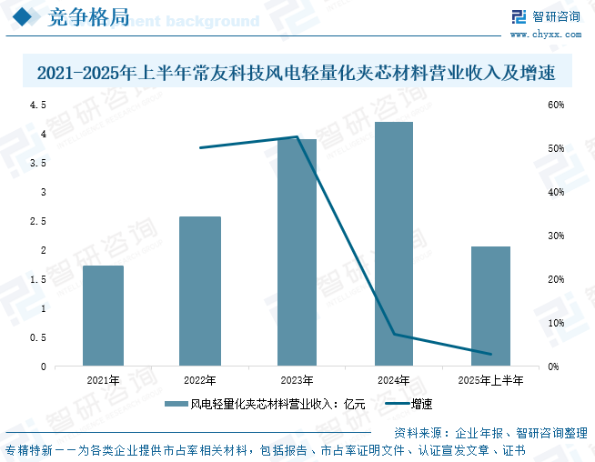 江苏常友环保科技股份有限公司主要从事高分子复合材料制品、轻量化夹芯材料制品的研发、生产与销售业务,产品主要包括用于风电领域的风电机组罩体、风电轻量化夹芯材料制品、罩体模具,以及轨道交通车辆部件等。公司依托在高分子复合材料和轻量化夹芯材料应用领域积累的丰富经验,聚焦新兴产业配套需求,持续推进产品创新、优化产品结构、完善生产基地布局、拓宽产品应用领域,形成产品覆盖风力发电、轨道交通等领域的多元化结构。在轻量化夹芯材料方面,公司产品主要包括巴沙木制品、PVC泡沫制品、PET泡沫制品,主要用于风电叶片生产。2025年上半年公司风电轻量化夹芯材料实现营业收入2.06亿元,同比上涨2.8%。