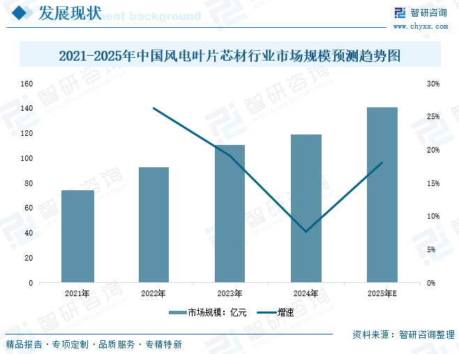 随着我国风电行业的快速发展,风电装机容量不断提升,市场对于风机和风电叶片的需求巨大,进而带动了风电叶片用材料需求规模的增长。风电叶片芯材作为风电叶片的重要组成部分,通常安装在叶片的前缘、后缘以及腹板等部位,一般采用夹层结构来增加结构刚度,减少叶片重量,防止局部失稳、提高整个叶片的抗载荷能力。近年来,在风电叶片大型化、轻量化发展趋势下,我国风电叶片芯材行业也步入发展“快车道”,行业市场规模从2021年的73.5亿元增长至2024年的119亿元,预计2025年行业市场规模增长至140.5亿元,同比上涨18.1%。